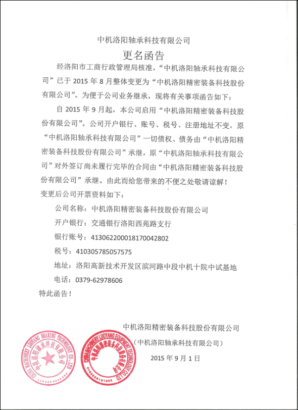 中机洛阳轴承科技有限公司更名函告
